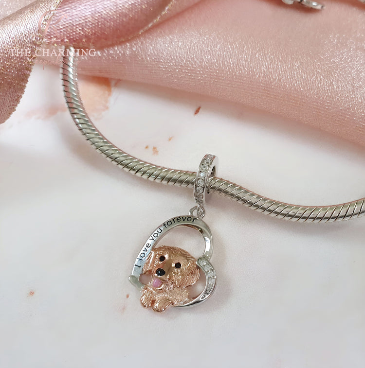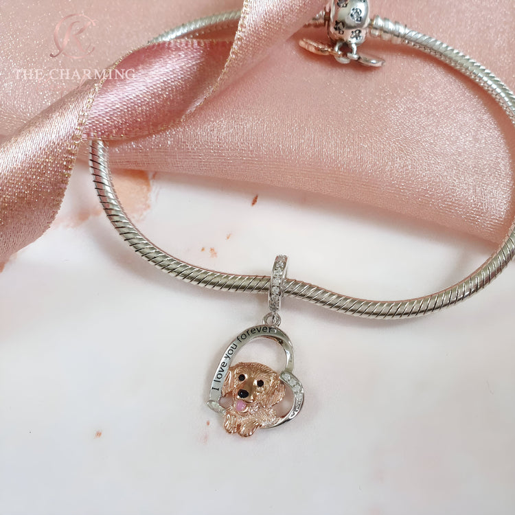 Golden Retriever-Hund-Charm aus 925er Sterlingsilber und Roségold – „I Love You Forever“.