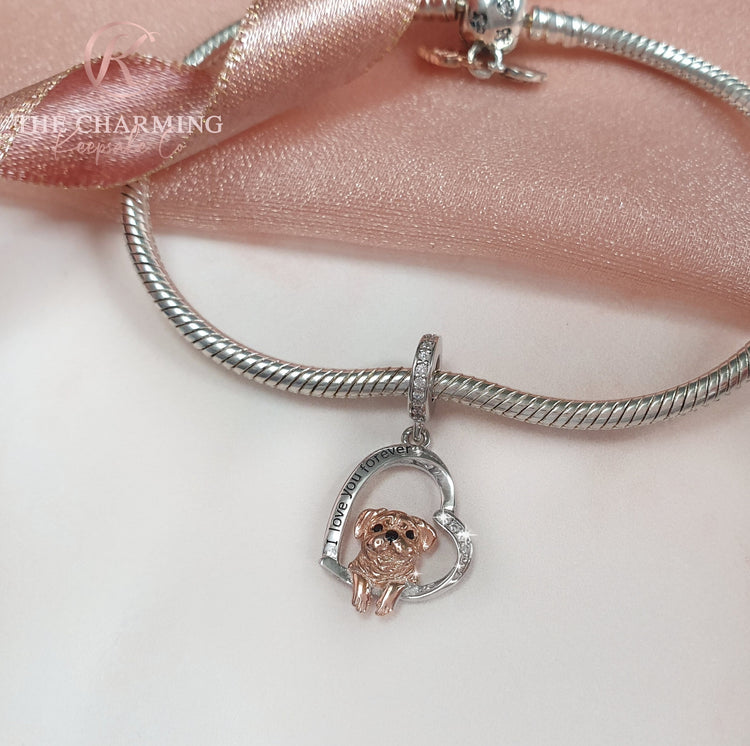 Mops-Hund „I Love You Forever“-Anhänger aus 925er-Sterlingsilber und Roségold