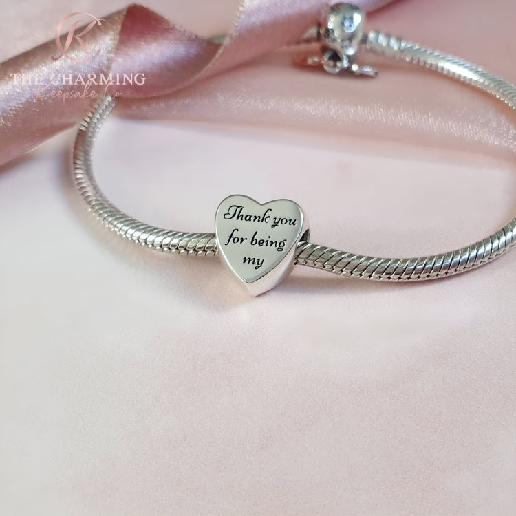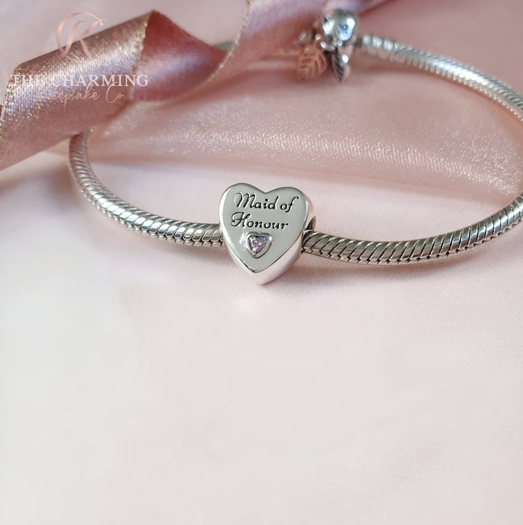 Magnifique breloque en forme de cœur en argent sterling 925 de haute qualité, dotée d'un cœur en cristal de zircone cubique rose étincelant et inscrite « Demoiselle d'honneur » ou « Maid of Honor ». Le revers de la breloque porte l'inscription « Merci d'être mon ». Le cadeau parfait pour votre journée spéciale.