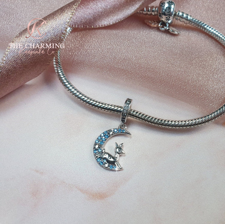 Magnifique breloque en forme de lune et d'étoiles en argent sterling 925 de haute qualité, décorée de cristaux de zircone cubiques bleu ciel étincelants et mettant en vedette Bambi le cerf ; un ajout super mignon pour votre bracelet à breloques ou un cadeau pour quelqu'un de spécial.