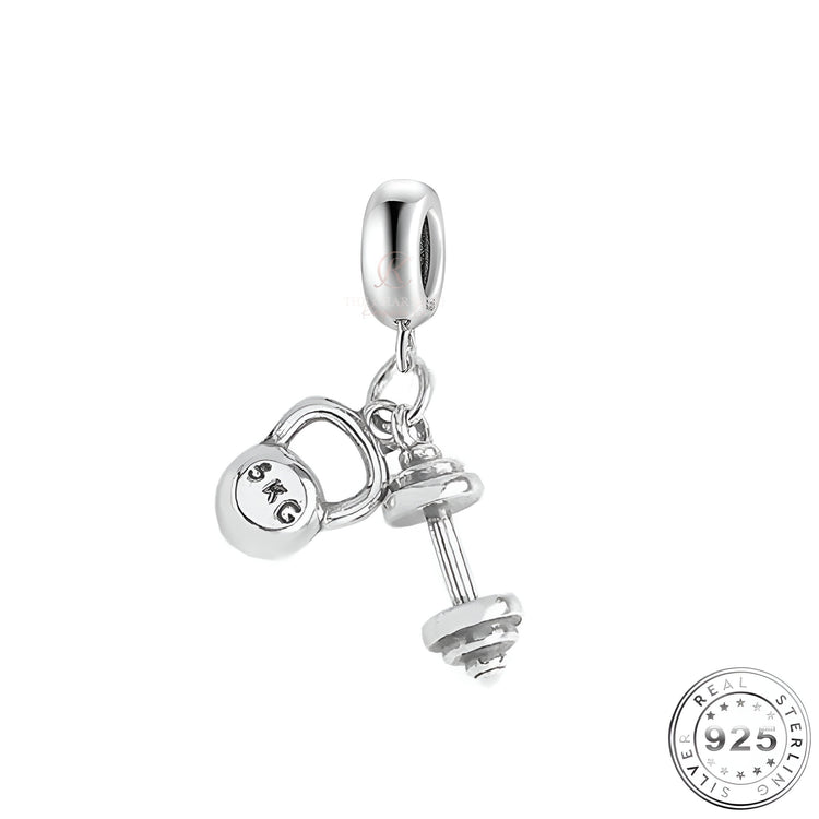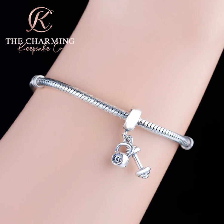High quality 925 sterling silver charm featuring a Dumbbell and a 5kg Kettlebell pendant; the perfect addition for your charm bracelet or gift for someone who loves the Gym!