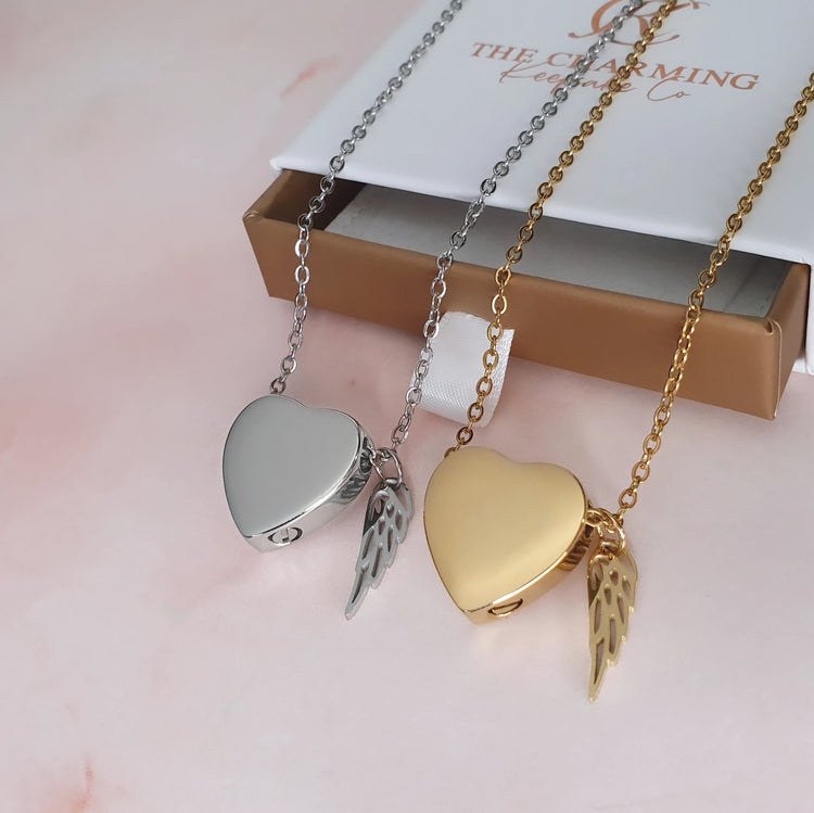 Keep your loved one close to your heart with this gorgeous ashes necklace. The necklace is crafted from high quality polished stainless steel and features a heart pendant and angel wing (you can remove the angel wing if preferred).
