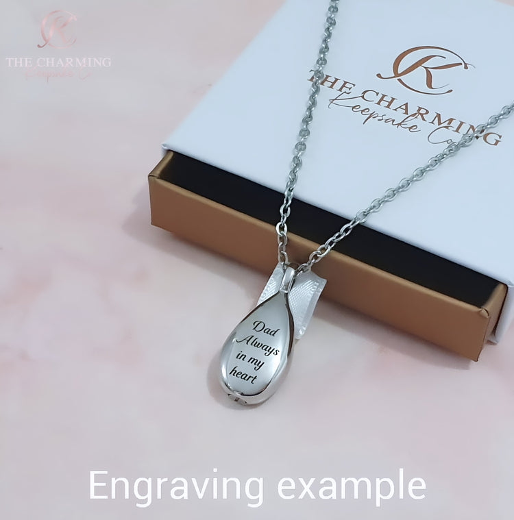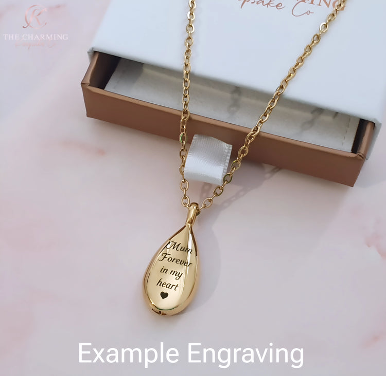 Engraved Teardrop Ashes Urn Necklace Gold or Silver
