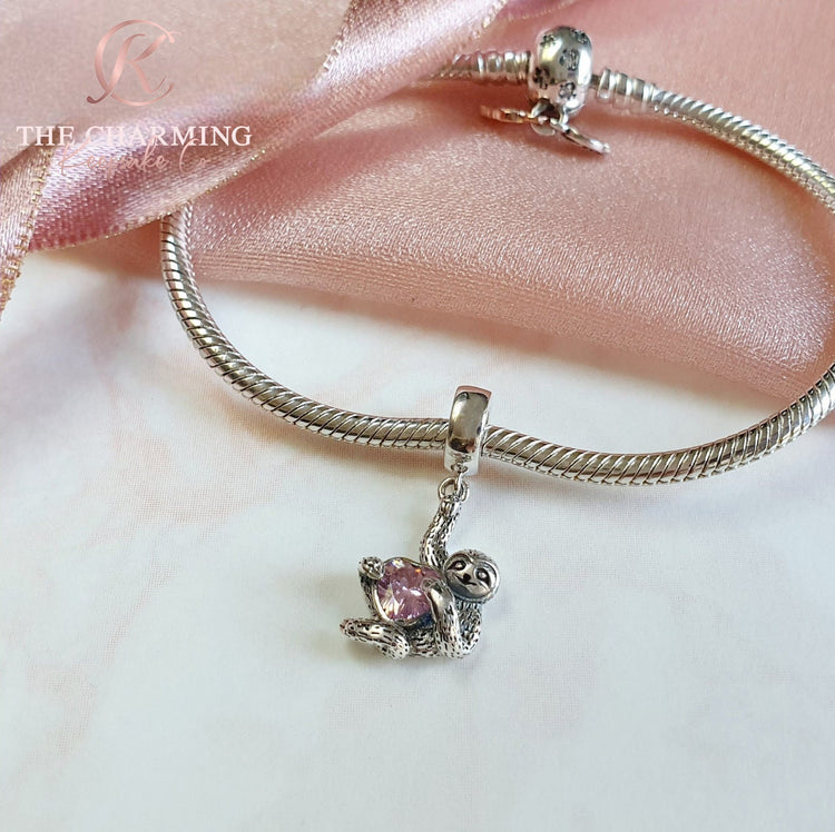 Beautiful and high quality 925 sterling silver charm featuring a Sloth pendant holding a sparkling pink cubic zirconia heart. Simply relax -the Sloth Charm symbolically reminds you of this and at the same time is super cute.